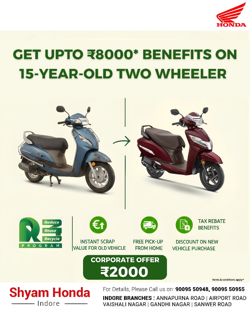 - ♻️ 15 साल पुरानी टू-व्हीलर पर पाएं ₹8,000 तक का फायदा!* ✅ Instant Scrap Value
